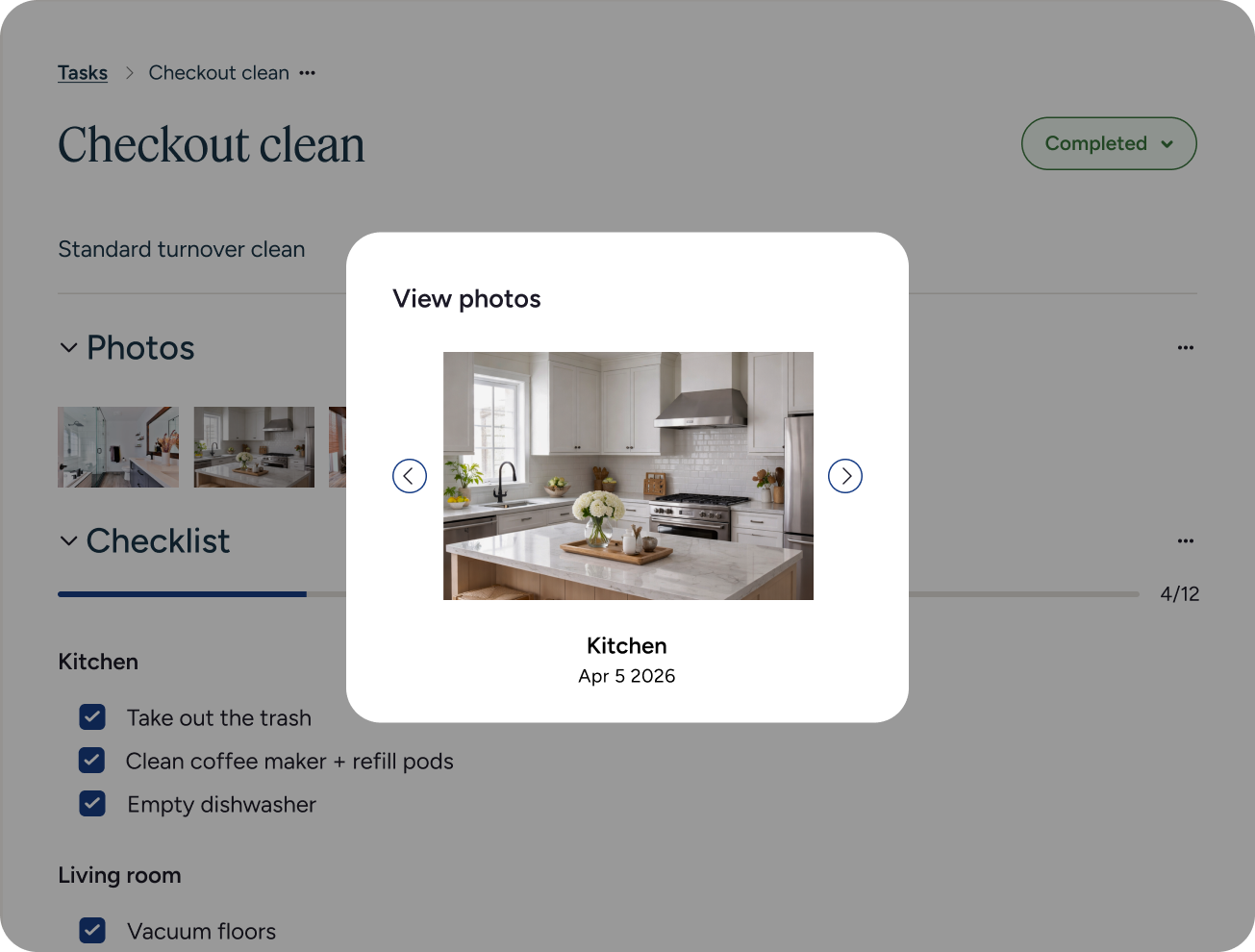 Templates are available for common tasks like smoke alarm checks, lock battery changes, AC filter cleaning, and deep cleans. You can also create custom repeating tasks to match your operations.